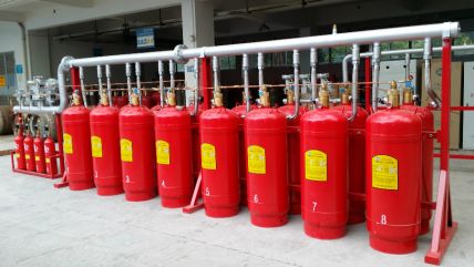 包括滅火劑儲存鋼瓶,氮氣驅動鋼瓶,容器閥,單向釋壓器,液位計,氮氣輸送管路組件,連接管,單向閥。分配裝置以及管網(wǎng):包括選擇閥,管網(wǎng),噴嘴等。